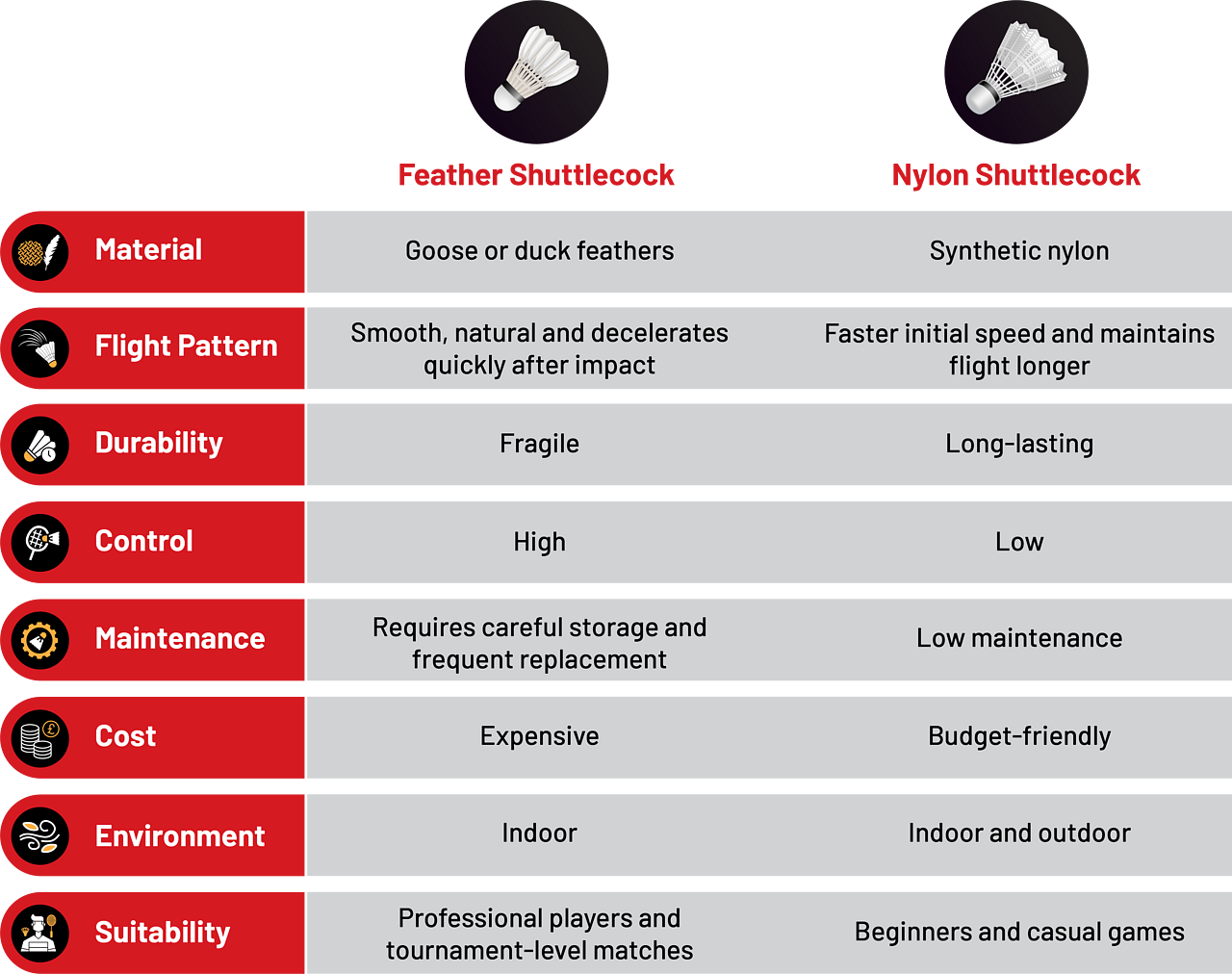 Feather shuttlecocks and nylon shuttlecocks have their own strengths for badminton match play. Feather shuttlecocks offer precision, control, power and the authentic feel that professionals need. Nylon shuttlecocks, on the other hand, provide consistency, durability, and great value, making them ideal for training and casual games. You can choose the shuttle that suits your playing skills and goals.
